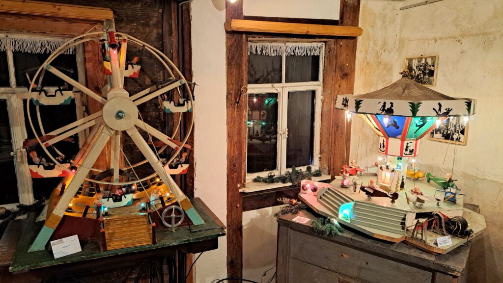 Der Ausstellungsraum im Museums-Seitengebäude beherbergte neben Puppenstuben und verschiedenartigen alten Pyramiden einen mechanischen Berg von Werner Markgraf, altes Blechspielzeug mit Antriebsmaschine, ein sogenanntes